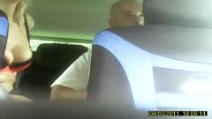 Eles se beijam e ficam quentes no banco de trás do carro, a loira monta seu namorado e o fode até ele gozar