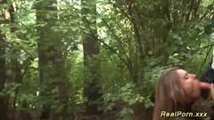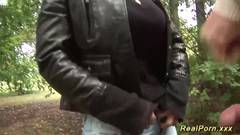 Cena de sexo ao ar livre em que uma loira gostosa pega boquete profundo e trepa no grande galo até o cara gozar nas nádegas.