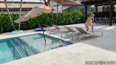 Essa loira malandra toma banho de sol nua. Depois de se bronzear, ela vai foder com um cara na piscina.