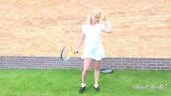 Ao ar livre, essa loira fica nua e se dedilha na grama enquanto assiste a uma aula de tênis, pois as bolas a excitam muito.