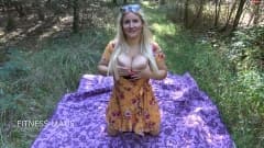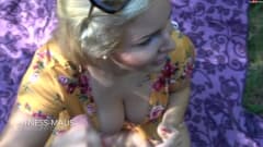 A garota loira se levanta no meio das árvores para dar um boquete a um cara e acaba trepando sua pila como uma vaqueira invertida.