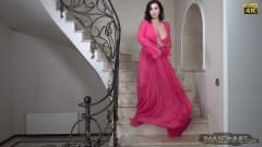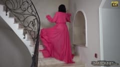 Uma sensual MILF de cabelos escuros desce as escadas várias vezes para que possamos apreciar como seus peitos enormes saltam sob seu vestido esvoaçante.