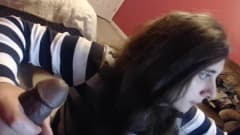 Essa doce Tgirl está desfrutando desses grandes centímetros do grande galo preto usando suas mãos e sua boca suja