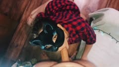 Prostituta com máscara de gato lambe o cu de um cara