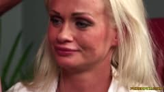 Duas loiras, uma madura e a outra jovem, estão sentadas e entre elas há um cara nu com um pau enorme. A madura ensina a garota a chupá-lo!