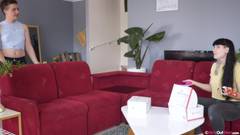 Essas duas garotas safadas vão se tocar e se masturbar discretamente no sofá, mas sem entrar em contato uma com a outra. Olhando uma para a outra, elas ficam excitadas.