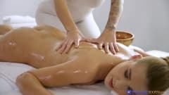 Depois de uma massagem com óleo de tirar o fôlego, elas se deixam seduzir por uma boa sessão de cunilíngua e até são apalpadas com os dedos. Que delícia!