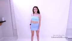 Uma linda garota de 18 anos usa uma saia e um top azuis e mostra seu talento com um pau!