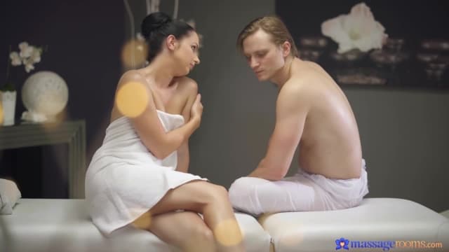 Esse massagista tem uma das clientes mais bonitas deitada, completamente nua na frente dele, e simplesmente coloca óleo em seu corpo para começar a transar com ela.