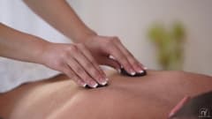 A loira começa a massagear o homem, ela o chupa por um tempo e o homem começa a massageá-la, deitando óleo. Depois de tudo isso, eles acabam transando.