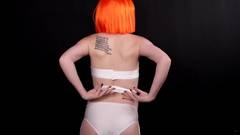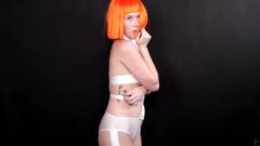 Ela usa uma peruca que a torna ainda mais sexy, ela tem faixas em torno de seus seios, ela se acaricia e mostra seus grandes seios