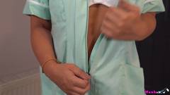 Uma enfermeira que é um pouco vadia vai se divertir na nossa frente sem sequer tirar o sutiã. Uma masturbação na hora do descanso do trabalho.