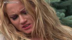 Uma loira com a buceta raspada é fodida por um pau grande e brinquedos sexuais, ao ar livre em um parque.