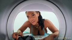 Halle Hayes, uma garota negra com uma bunda e peitos grandes, é pega de surpresa no estilo cachorrinho enquanto tem sua cabeça presa na máquina de lavar.