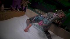 Uma loira com um corpo completamente tatuado tem uma coleção de brinquedos sexuais extremos. Ela ama o BDSM!
