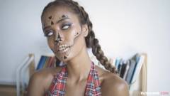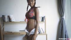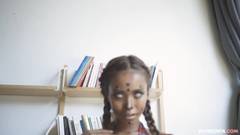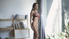 Putri Cinta é muito magra, mas também tem seios grandes. Nessa cena, ela demonstra a masturbação e o orgasmo excitantes.