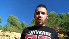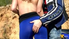 Depois de uma curta caminhada, esta morena peituda fica sendo perfurada por este homem musculado ao ar livre, sem medo de vir alguém!