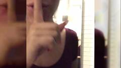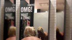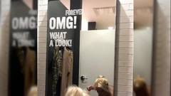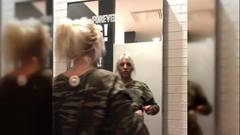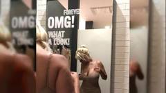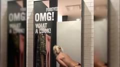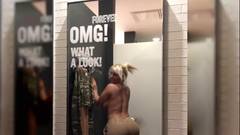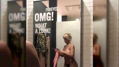 Uma loira linda e luxuriosa mostra seu corpo para a câmera em um provador. Seus grandes peitos e seu lindo traseiro nos excitam