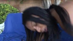 Samoa é uma quente e sexy negra sentada no banco para se masturbar até que cara passa e decide montar sua buceta.