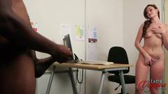 Essa vadia se despe enquanto trabalha e seu cliente também! Ela não consegue acreditar em seus olhos quando vê o grande pênis dele