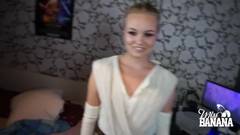Eles estão brincando de Guerra nas Estrelas, e o cara manda que a Miss Banana chupe o pau do mal. Ela chupa metendo no fundo da garganta até ele ejacular!