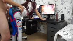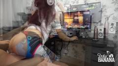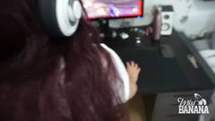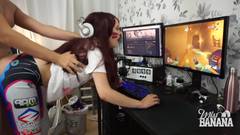 Enquanto ela está jogando de pé, o cara da Miss Banana vem de trás e a salta. Ela se distrai, mas sem perder o jogo, e toma um creampie