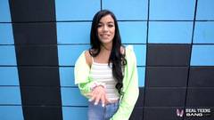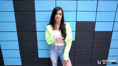 Esta garota latina mostrará suas mamas lá fora e fará um broche no carro, então ela seguirá o cara para pegar seu aparelho.