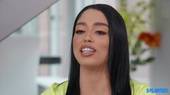 A bombada se dedilha antes de ser levada ao sofá, ejacula e espirra no sofá, lavando-o com a língua.