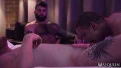 Jay e Ryan chupam as piças um do outro e fodem o rabo um do outro na frente do musculoso Markus, que observa a cena enquanto ele bate uma punheta excitado.