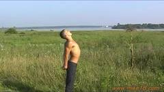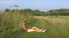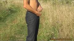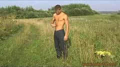 Este jovem quente está se masturbando num campo e ele está desfrutando do sol até ejacular sozinho. Imagine em que esta pensando esse pauzudo.