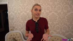 Essa loira começa com uma provocação de listras em um pequeno lingerie vermelho e depois passa a chupar pênis de plástico e estilo cãozinho