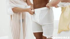 O cara muscular se divertirá com suas duas esposas, elas o sugarão juntas e ele se revezará para foder elas! Um cara realmente sortudo!