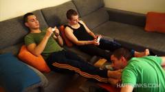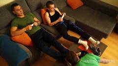 Dois gays jogam jogos de vídeo enquanto o seu escravo limpa e lambe os seus pés. Depois o casal se beija e acaricia-enquanto o outro assiste submissamente.