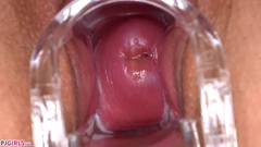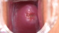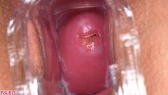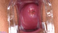 Ela nos mostra o interior de sua vagina rosada e úmida