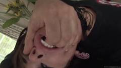 Ela é uma puta morena linda e sexy que se ajoelha ao lado do pênis dele e começa a chupá-lo muito bem