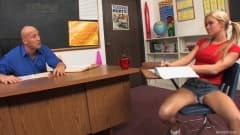 Esta puta loira é completamente oferecida na escola e seu professor encontrou uma forma de puni-la: colocou seu pênis grosso em seu pequeno bichano suave.