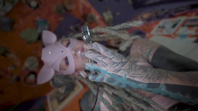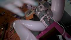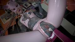 A garota hiper-tatuada Anuskatzz veste sua roupa de couro rosa para esta cena solo. Ela coloca eletrodos em sua bichana para sair