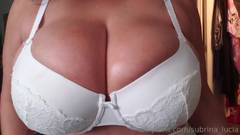 A deslumbrante Subrina Lúcia parece sexy, pois seu sutiã mal consegue manter suas enormes mamas no lugar.