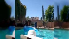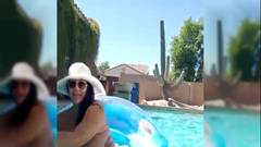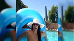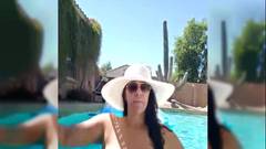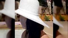 Uma morena madura se sente excitada nas férias e decide se filmar mostrando seus enormes peitos nus à beira da piscina.