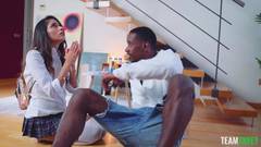 Essa gostosa safada abre as pernas como louca e é com sua saia de estudante safada que ela vai excitar esse negro como nunca antes
