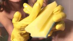 Essa loira sexy finge limpar enquanto o cara está ficando cada vez mais excitado. Ela lhe dá uma punheta com suas luvas de borracha.