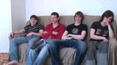 Os quatro amigos se sentam juntos para medir seus pênis e se masturbar enquanto ejaculam no mesmo recipiente.