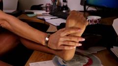 Dannii Harwood, uma loira pervertida, veste-se de preto e toca seus pés sensuais enquanto agrada seus subordinados com seu sex appeal.