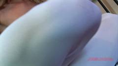 Jasmine se acaricia de perto e enfia o dildo, depois é fodida e recebe um creampie no fundo.