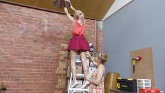 Essa loira sobe em uma escada para trocar uma lâmpada e sua amiga olha para a bunda dela por baixo da saia e propõe um encontro lésbico.