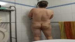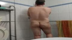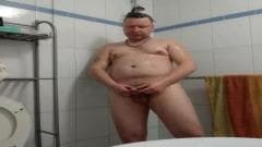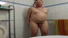 Um homossexual gordo e maduro nos provoca sacudindo suas nádegas e se masturbando no chuveiro. Não perca isso!