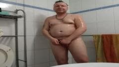 ![Homem maduro fica animado e disfruta de seu banho Homem maduro fica animado e disfruta de seu banho]()