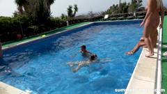 Essas ninfas estão se divertindo nessa suruba junto à piscina