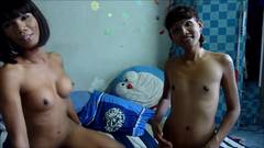 Essas duas garotas trans morenas gostam de se masturbar juntas. Elas se deitam juntas na cama com seus pênis nas mãos e batem nelas até que ambas gozem.
