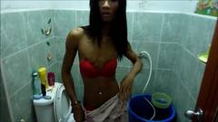Essa travesti sexy está pronta para se divertir no banheiro enquanto se masturba e goza na mão.